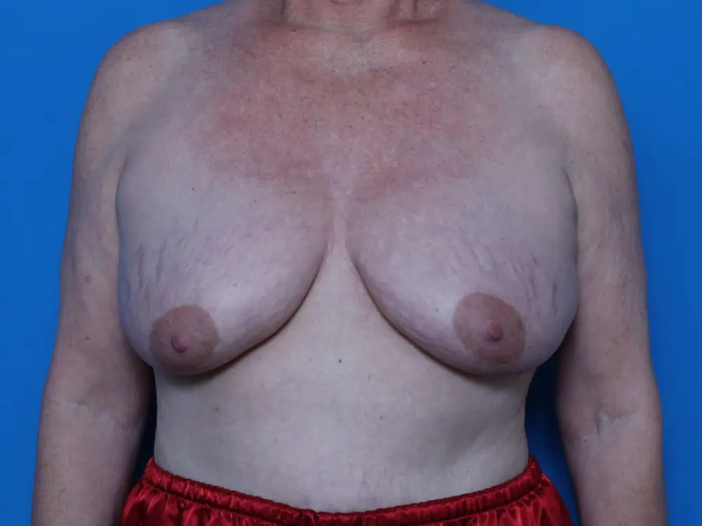 This woman in her 60s is shown 5 months after a breast lift and augmentation using moderate classic profile 255cc breast implants.